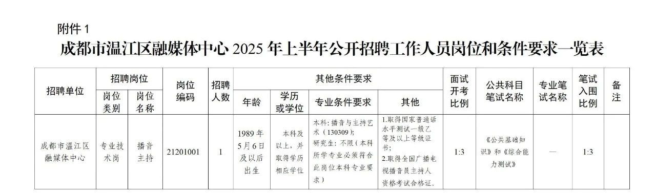 招聘岗位及名额:成都市温江区融媒体中心面向社会公开招聘工作人员1名(现场报名);成都市温江区卫生健康局面向社会公开招聘工作人员17名。