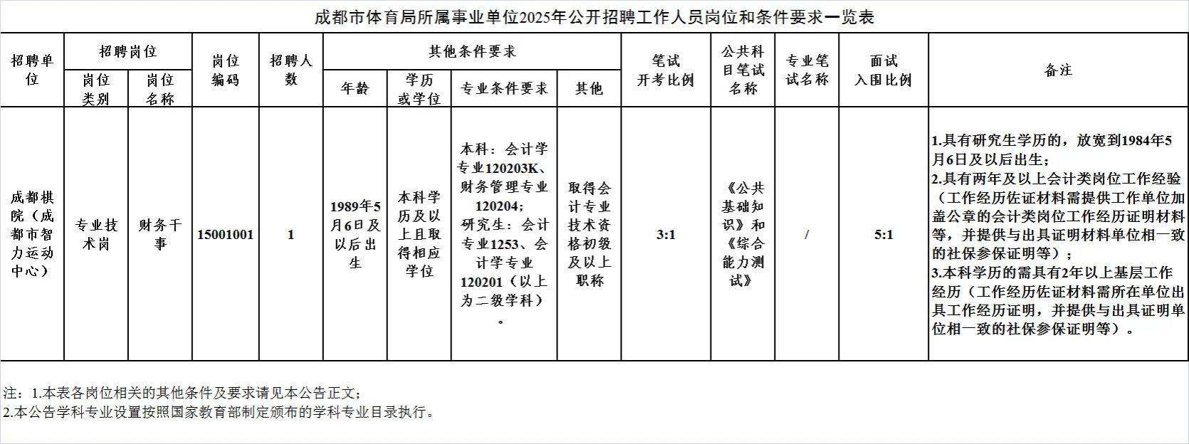 招聘岗位及名额:成都市体育局所属事业单位成都棋院面向社会公开招聘工作人员1名。
