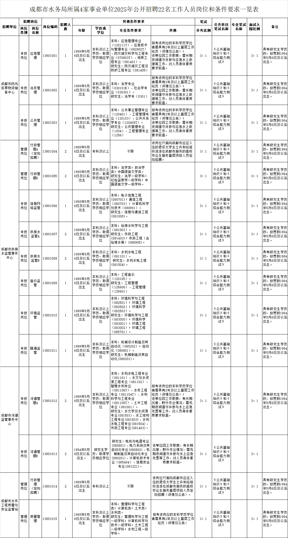 招聘岗位及名额:成都市水务局所属4家事业单位面向社会公开招聘工作人员22名。