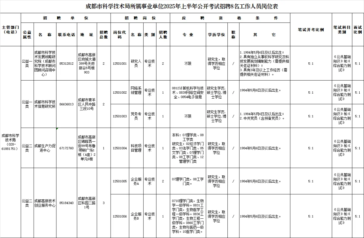 招聘岗位及名额:成都市科学技术局所属4家事业单位面向社会公开招聘工作人员8名。