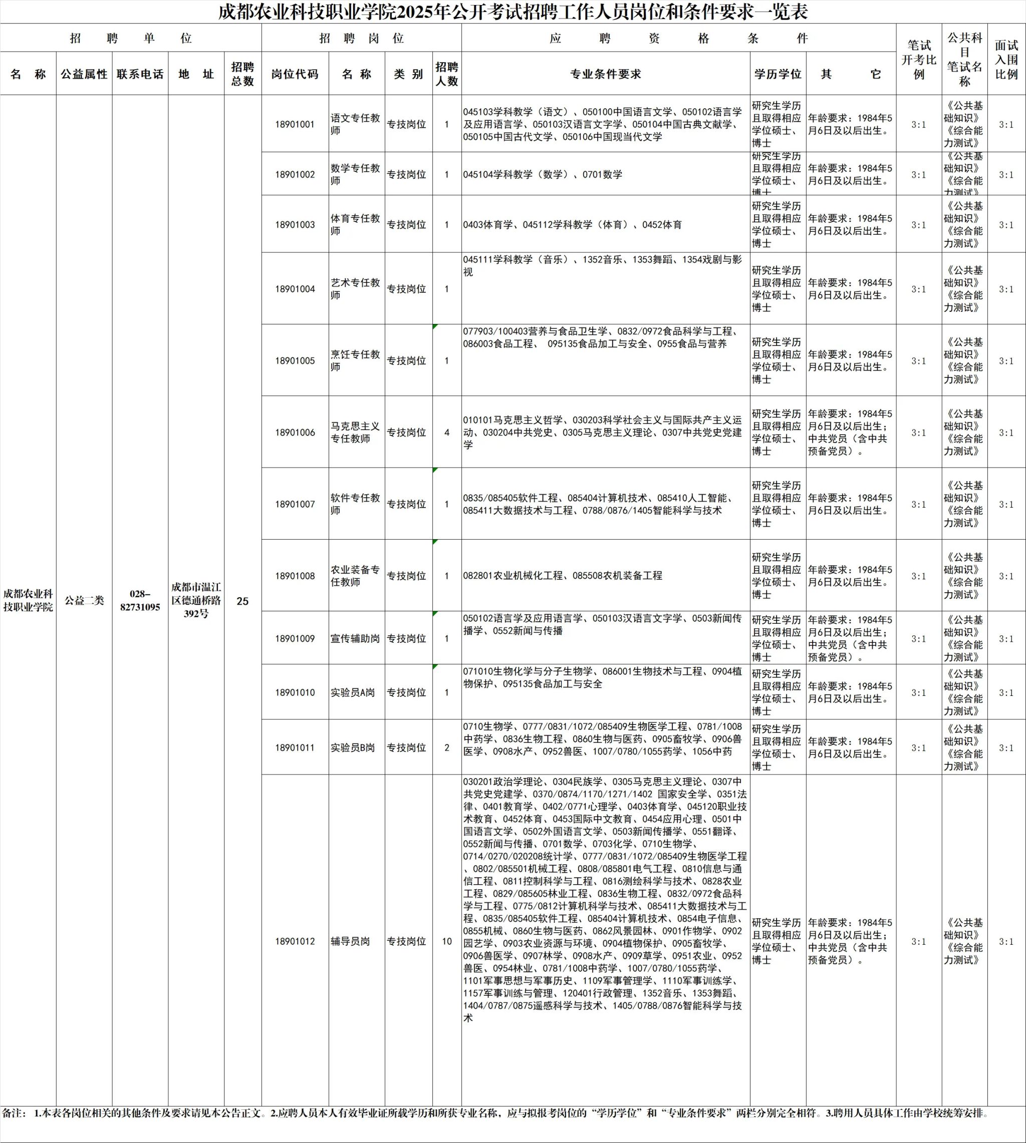招聘岗位及名额:成都农业科技职业学院面向社会公开招聘工作人员25名。