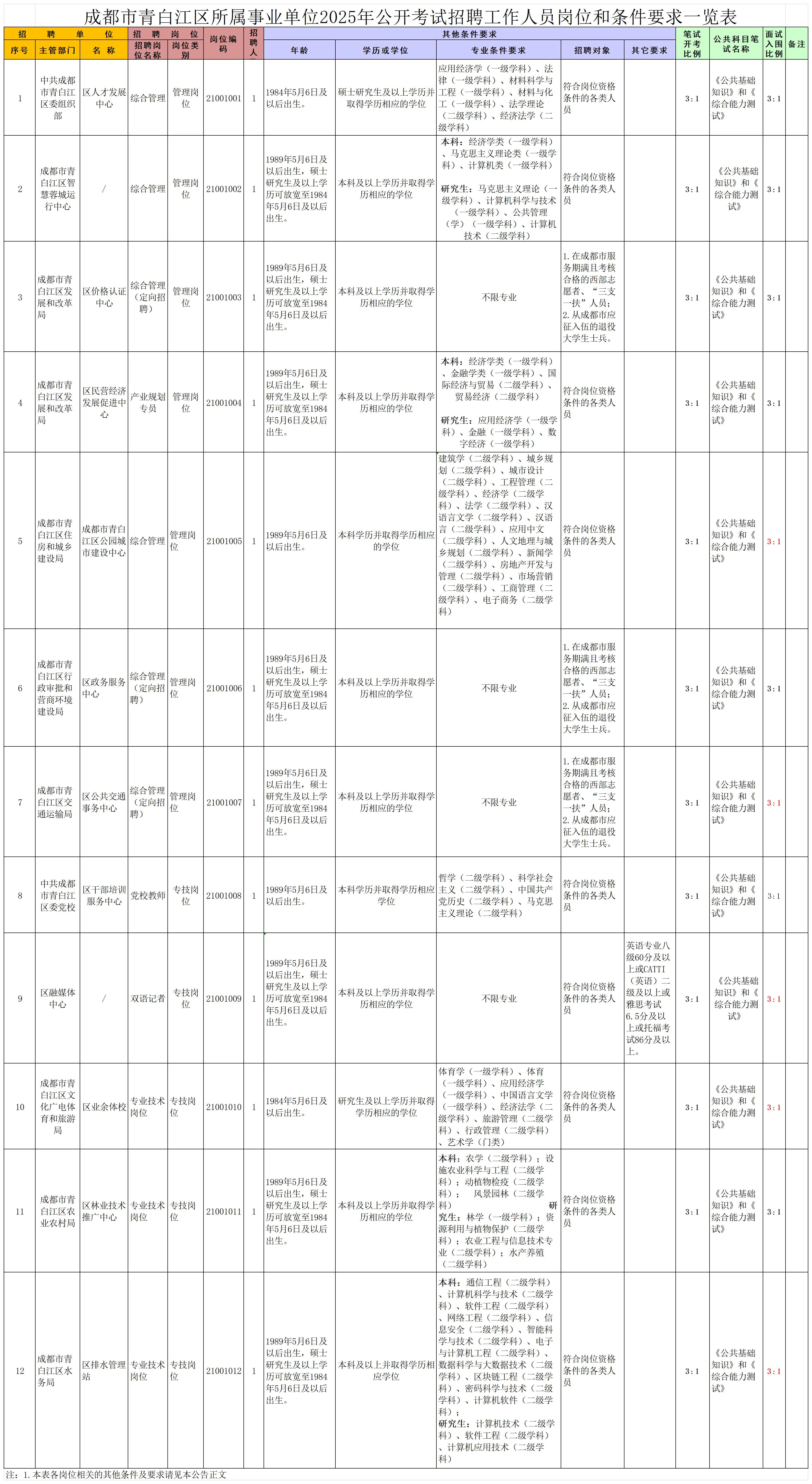 招聘岗位及名额:成都市青白江区所属事业单位面向社会公开招聘工作人员12名。