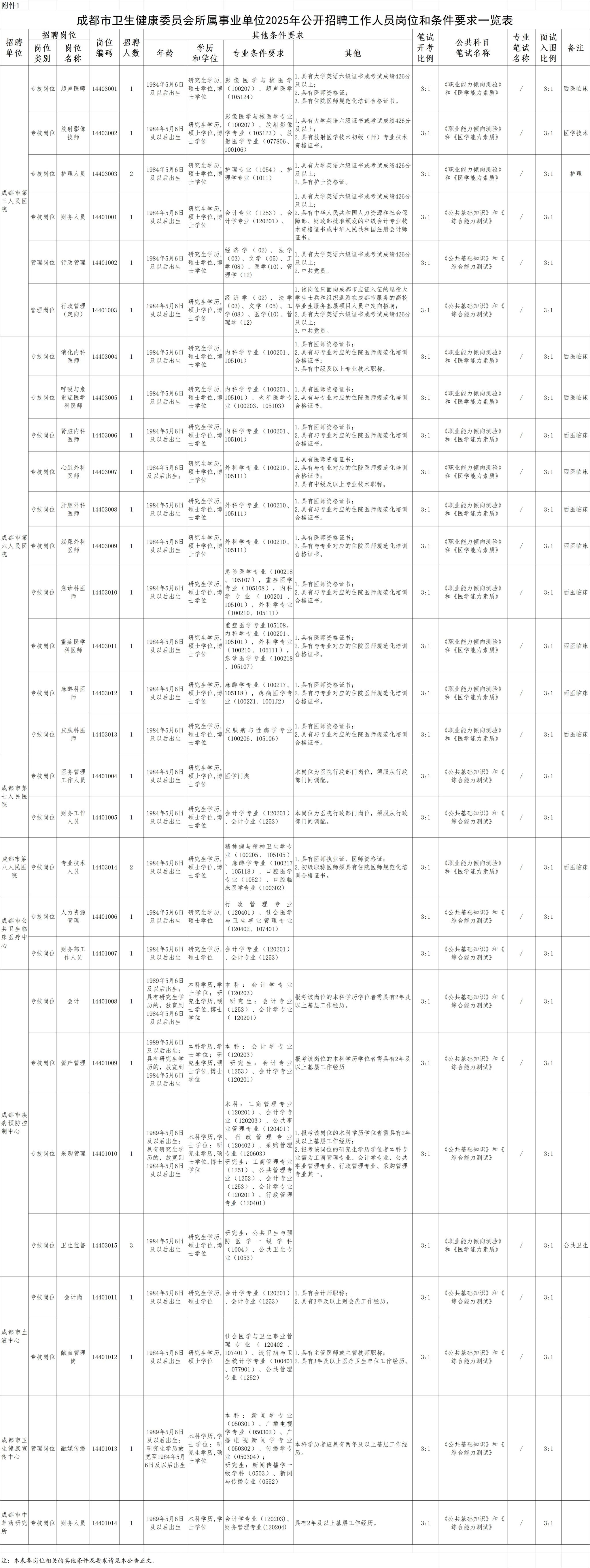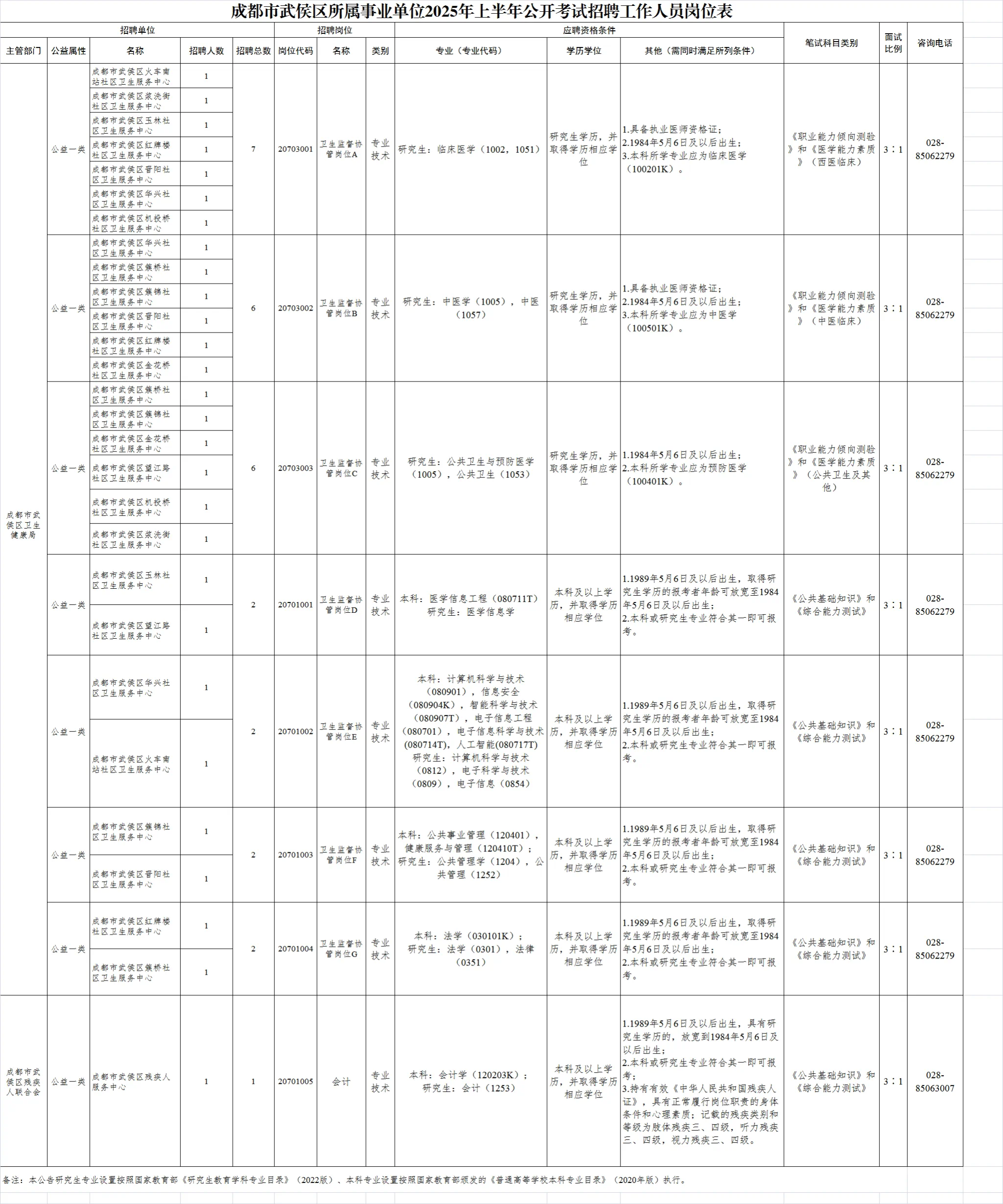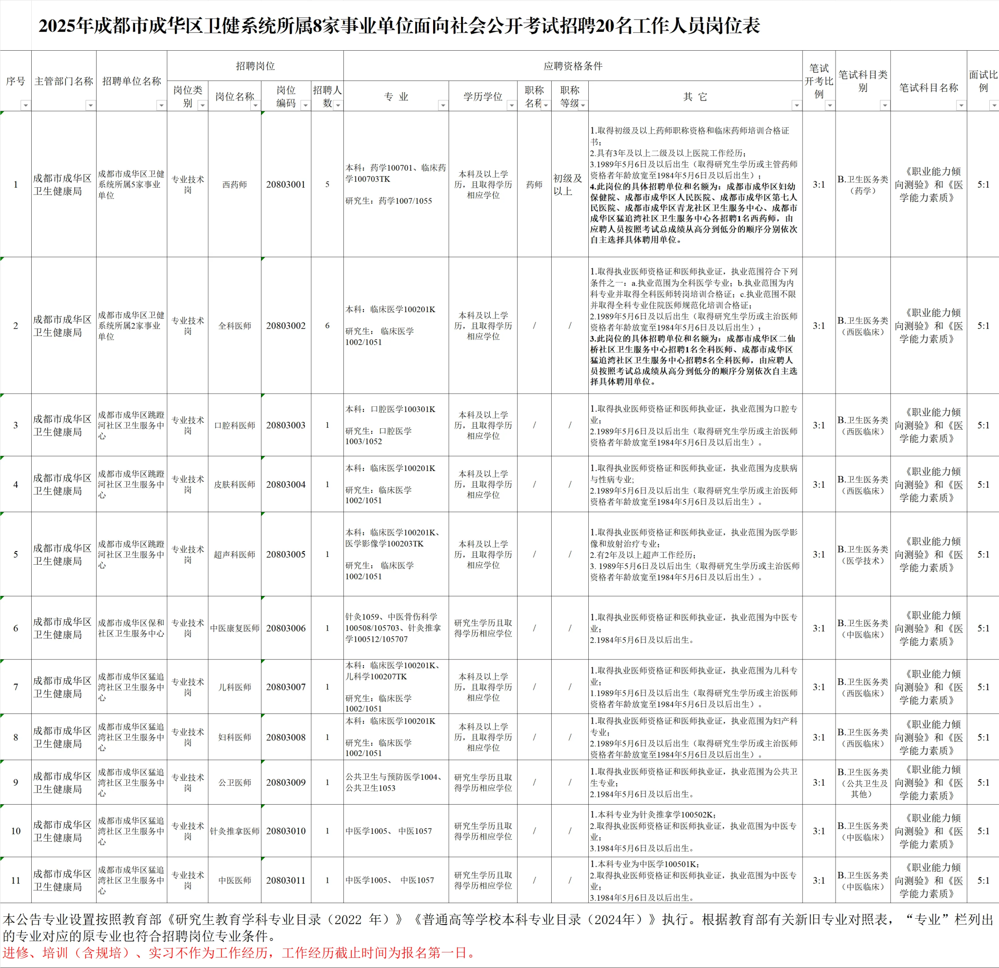 招聘岗位及名额:成华区卫健系统面向社会公开招聘工作人员20名。