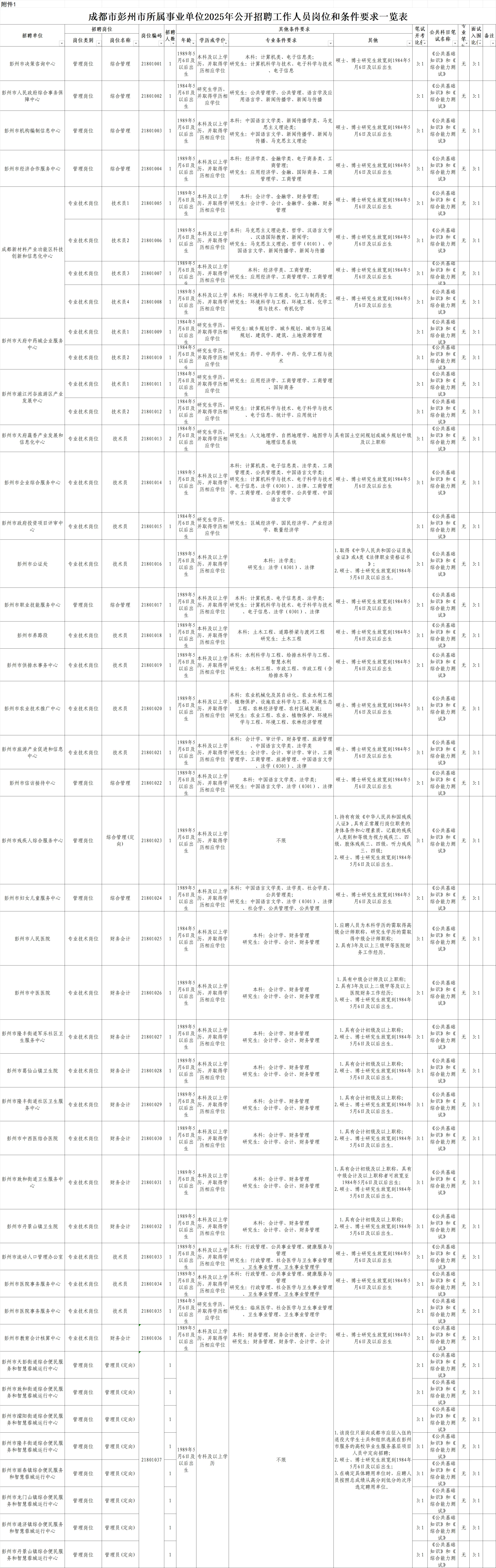 招聘岗位及名额:彭州市面向社会公开招聘工作人员45名;彭州市卫生健康局所属事业单位面向社会公开招聘工作人员25名。