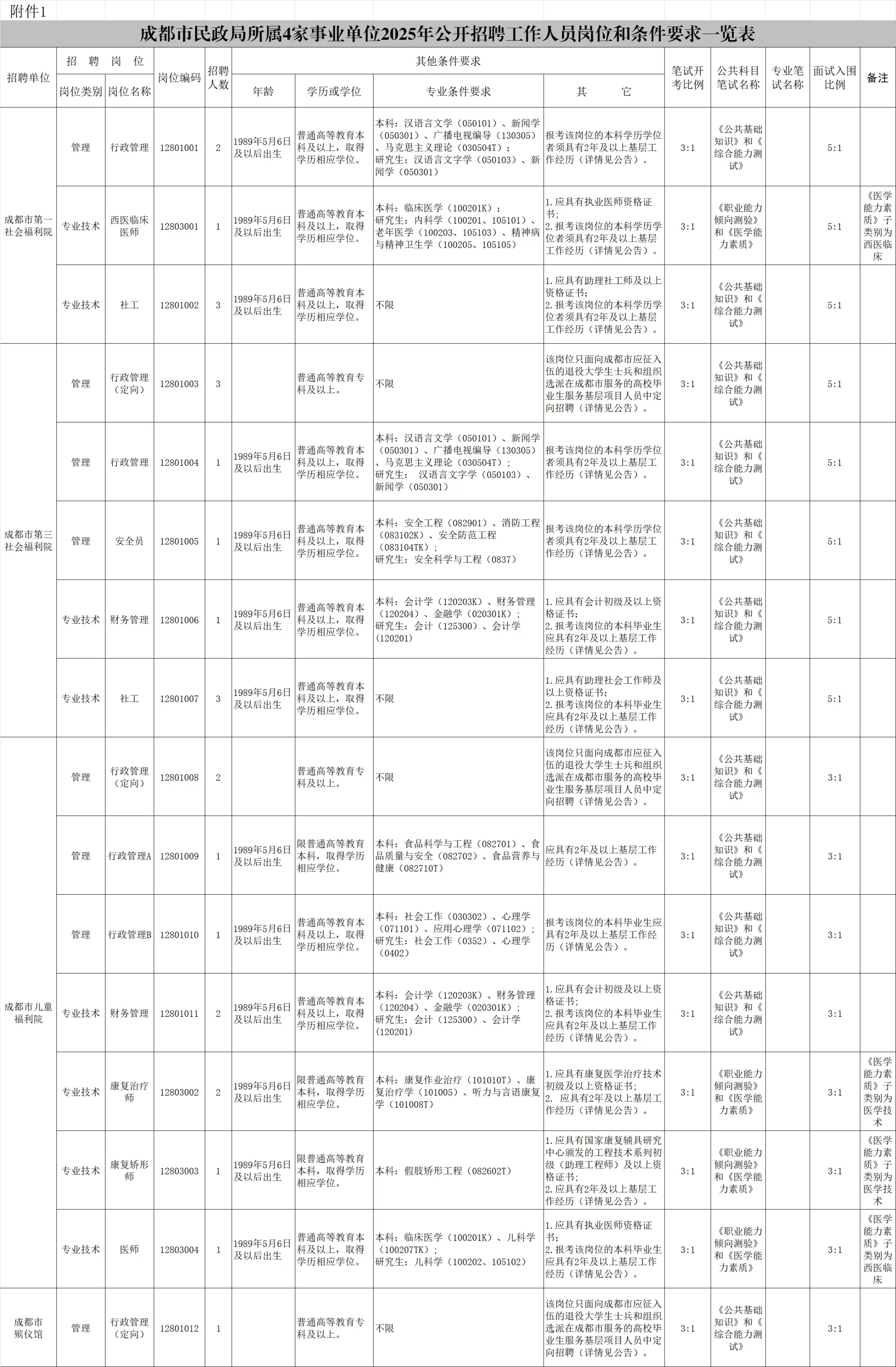 招聘岗位及名额:成都市民政局面向社会公开招聘工作人员26名。
