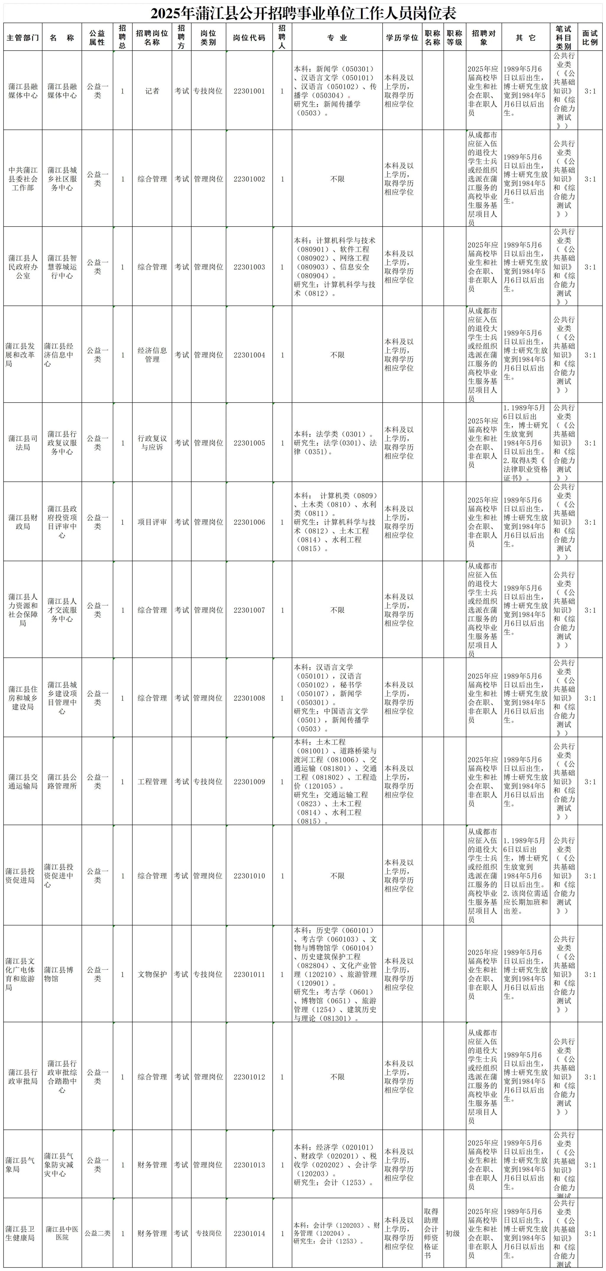 招聘岗位及名额:蒲江县现面向社会公开招聘事业单位工作人员14名;蒲江县医疗卫生事业单位现面向社会公开招聘事业单位工作人员23名。