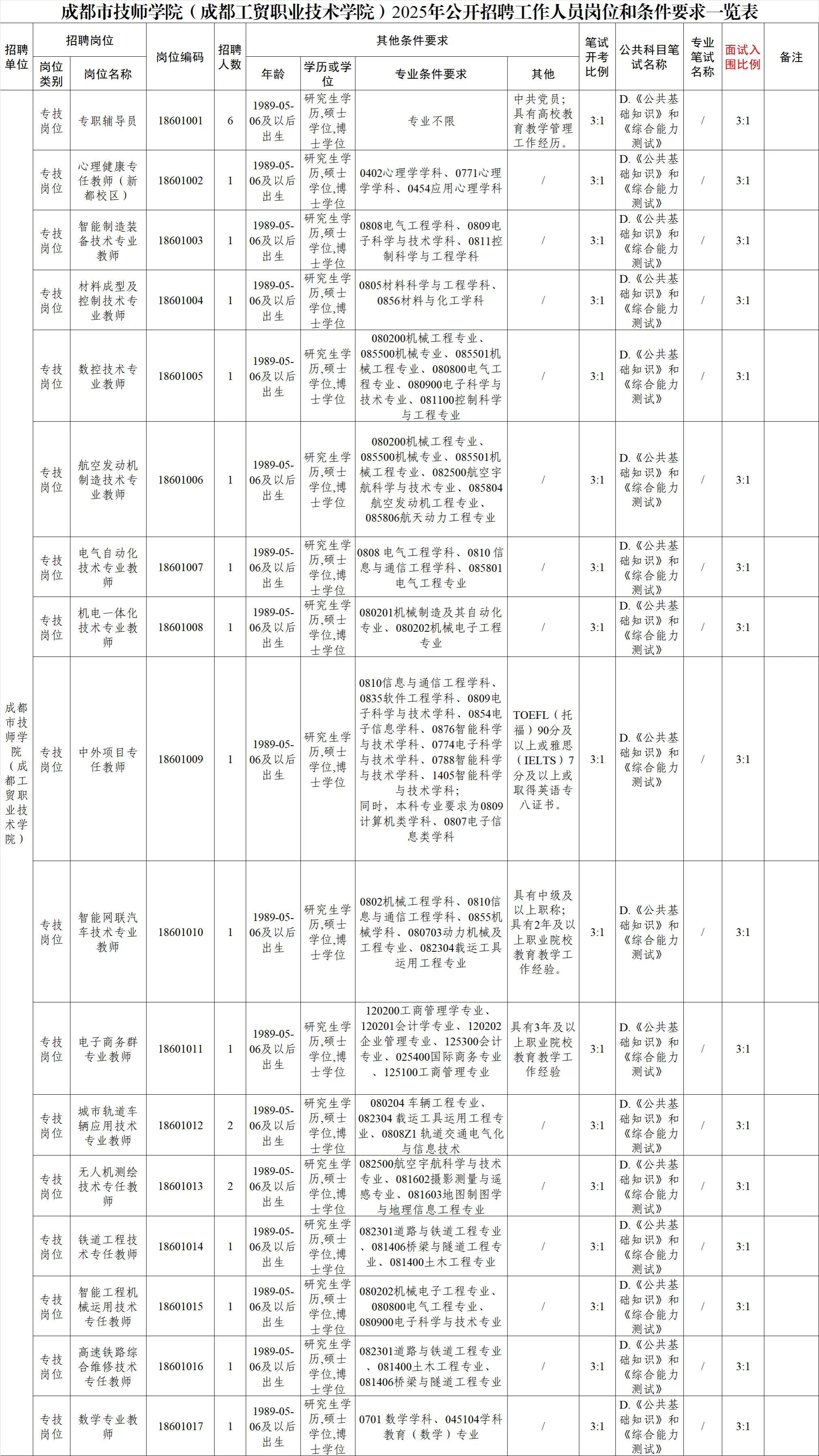 招聘岗位及名额:成都市技师学院(成都工贸职业技术学院)面向社会公开招聘工作人员24名。