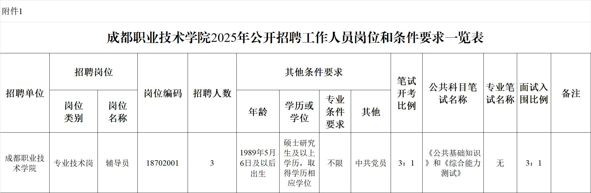 招聘岗位及名额:成都职业技术学院面向社会公开招聘工作人员3名。