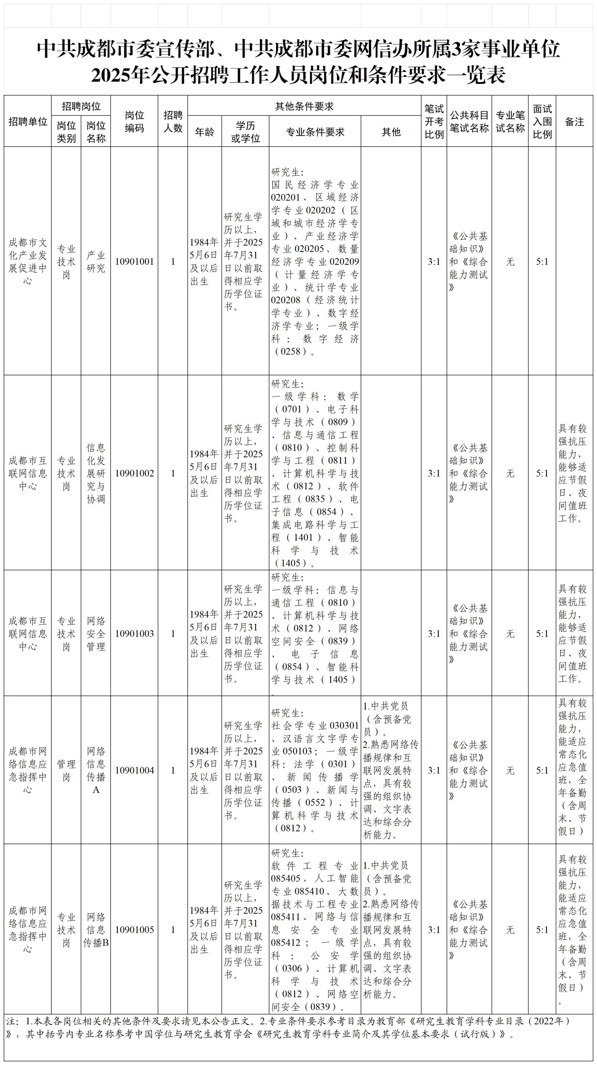 招聘岗位及名额:中共成都市委宣传部、中共成都市委网信办面向社会公开招聘工作人员5名。
