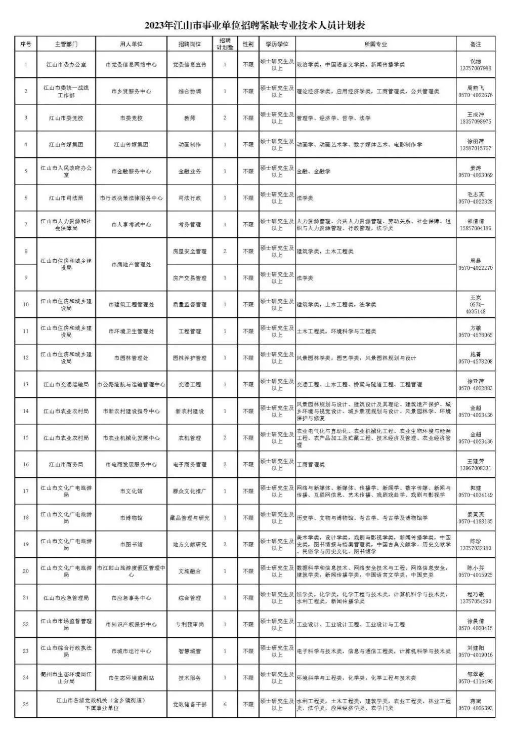 附件1:《2023年江山市事业单位招聘紧缺专业技术人员计划表》