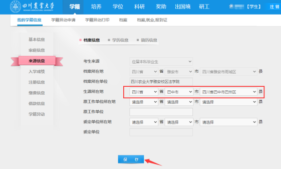 2、进入可编辑状态后,将“生源所在地”进行补充完善,应详细到区/县。
