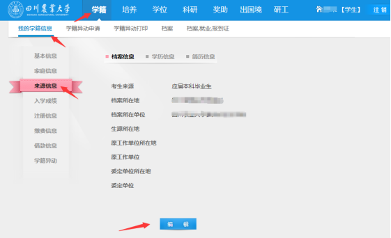 1、进入“学籍”-“我的学籍信息”-“来源信息”页面,点击“编辑”键。