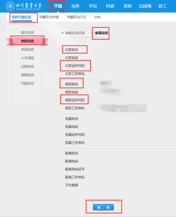 请务必在2月28日前登录我校研究生管理新系统,进入学籍-我的学籍信息页面,点击家庭信息,选择家属信息,将父母姓名及身份证号补充完善。逾期未填者,视为有工资收入的在职人员上报数据。