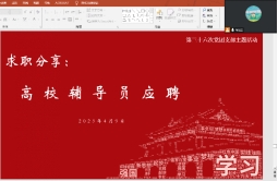 教育、科技、人才是全面建设社会主义现代化国家的基础性、战略性支撑。《中国共产党章程》将“充分发挥人才作为第一资源的作用”写入总纲,进一步强调了人才在社会主义现代化建设中的重要作用。支部理论学习结合新时代、新征程的人才要求,锚准支部党员同志近期的求职需求,以“人才第一资源”为理论延伸,进行了高校辅导员求职技巧专项学习分享。高校辅导员是高校思想政治教育工作的主力之一,也是高校不可或缺的重要人才资源,分享人张铭垚同志首先向大家介绍了高校辅导员的职业定位与职业价值,分条总结了新时代高校辅导员的主要职责,并剖析了高校辅导员的职业发展前景。通过张铭垚的讲解,支部同志对高校辅导员这一职业有了更加清晰的认识。张铭垚还结合有关政策和会议安排,鼓励支部党员把握时机,找准机会,在近期的高校辅导员招聘活动中多多尝试。紧接着分享人结合自我求职经验,针对支部同志的求职关注点,重点分析了高校辅导员这一职业的求职技巧,他主张大家发挥专业优势,主动作为,并建议大家以最好的心态进行求职备战。