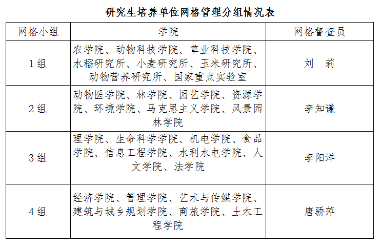将各培养单位分为4个网格组,指定研究生院思政科4名教师作为各网格组督查员,专门对接各培养单位的网格专员。网格督查员负责相应网格组研究生疫情防控的指令传达、政策咨询指导,以及督导人员摸排、数据汇总、信息报送、台账管理、健康打卡检查、核酸督查、应急处置等工作。